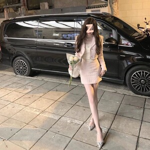 名媛小香风套装女韩版粗花呢短款粉色西装外套女高腰修身半身裙潮