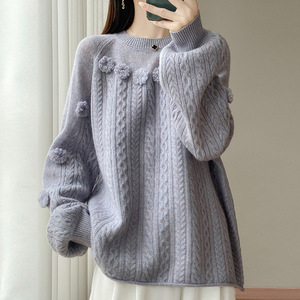 100丝光羊毛针织开衫女式圆领加厚毛衣秋冬新款手工钩花减龄内搭