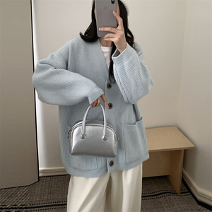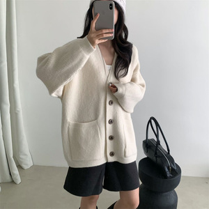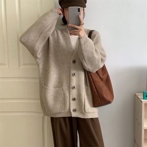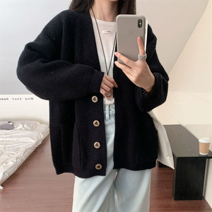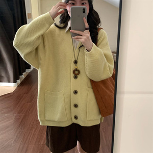 V领纯色毛衣开衫女秋冬季新款高级感加厚宽松慵懒风针织外套上衣