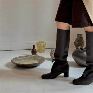 全牛皮~2025新款宽筒绑带真皮长筒靴女粗跟高跟长靴高筒靴骑士靴