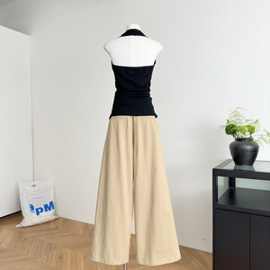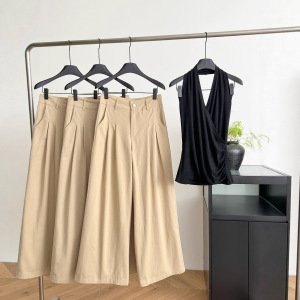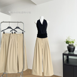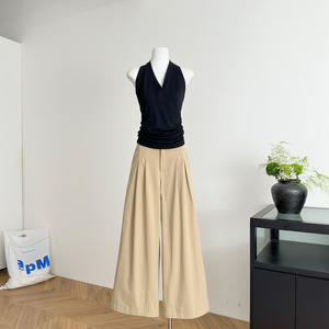 2025夏季新款 老钱精英风低腰质感春夏卡其有褶阔腿直筒拖地长裤