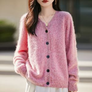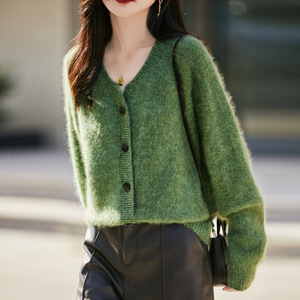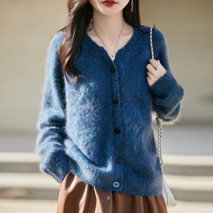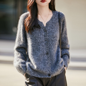 V领花纱拉绒羊毛开衫慵懒风针织毛衣外套 羊毛拉绒开衫软糯羊毛衫