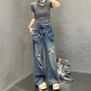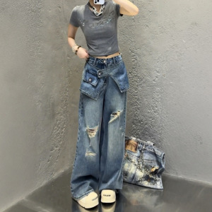 广州十三行高货爆款~2025新款胖mm显瘦破洞复古直筒梨型身材裤子