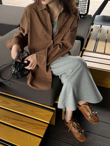 黎诺早秋新款韩系咖格刺绣衬衫+背心裙套装女2025时尚洋气秋装ins