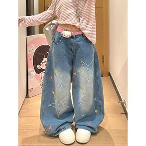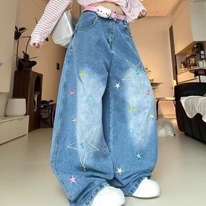 小个子美式复古彩色星星刺绣弯刀牛仔裤女夏季宽松显瘦阔腿拖地裤