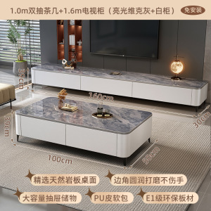 【免安装】1.0m双抽茶几+1.6m电视柜(亮光雪山白+灰柜软包)
