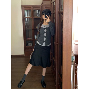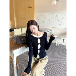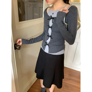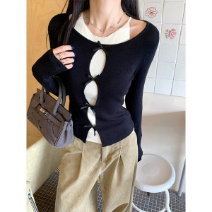 Moses Queen/魔西女王韩版纯欲假两件蝴蝶结长袖针织衫显瘦上衣女