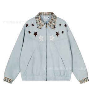 美式格子星星刺绣麂皮绒翻领开衫外套女秋宽松ins潮夹克上衣