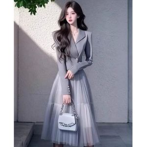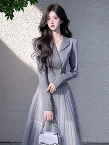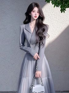 2025年春秋轻奢高级感气质名媛小香风灰色西装外套网纱半身裙套装