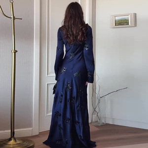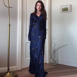2025年新款欧美亚马逊跨境外贸女装v领长袖收腰印花蓝色法式长裙
