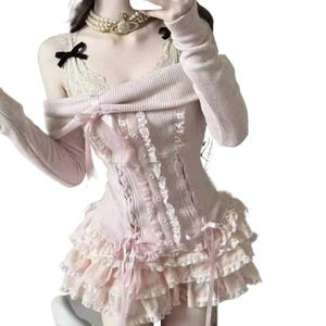 纯欲风甜美结一字肩长袖上衣蛋糕短裙少女两件套