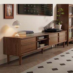 实木组合移门电视柜现代简约落地储物柜中古风小户型客厅电视机柜