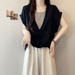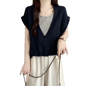 大码设计感撞色条纹假两件短袖T恤女夏季新款胖mm宽松显瘦上衣女
