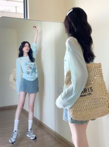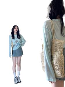 韩系趣味海星图案印花长袖t恤女夏季肌理感宽松微透防晒罩衫上衣