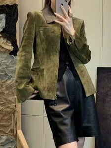 2025新款皮衣進口真皮森林绿绒面皮真皮翻领短款夹克拉链外套
