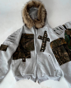 欧美跨境秋冬季节时尚街头潮流贴布拉链大毛帽卫衣跨境批发服装