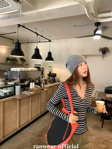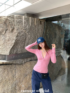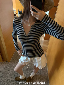 Ranwear 长期主义亨利t 小众百搭亨利打底衫撞色条纹修身针织t恤