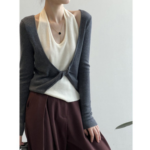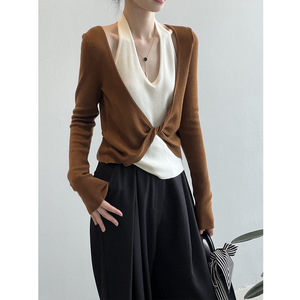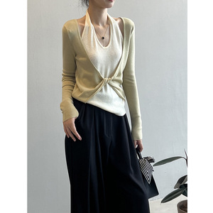 韩系穿搭韩系拼接假两件露肩挂脖上衣女秋季设计感U领打底针织衫