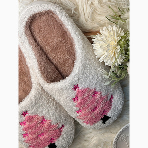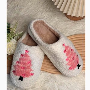 跨境新款秋冬加厚圣诞系列棉拖鞋粉色圣诞树毛毛拖鞋家居鞋保暖