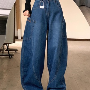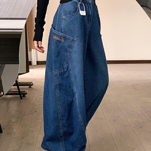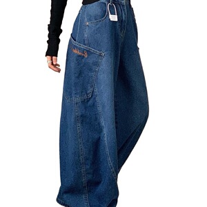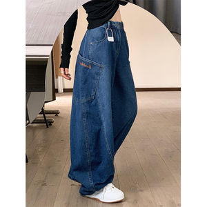 美式复古大口袋拼接弯刀牛仔裤女秋冬款辣妹高街设计感宽松阔腿裤