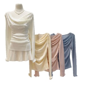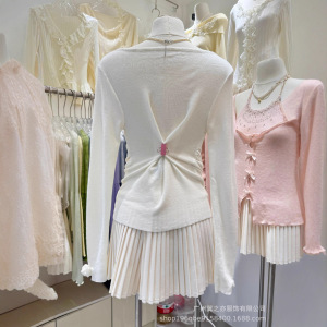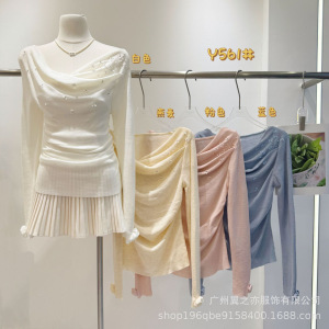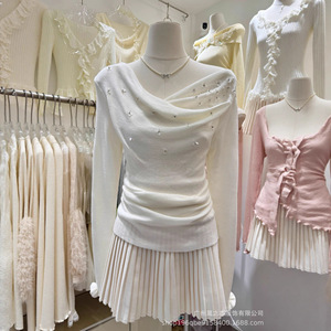 法式荡领长袖钉珠打底针织衫女侧边褶皱掐腰斜肩甜辣chic内搭上衣