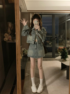 大码女装秋装新款烫钻牛仔复古外套+高腰半身裤裙两件套