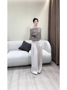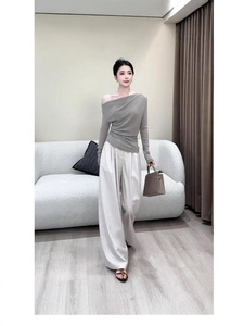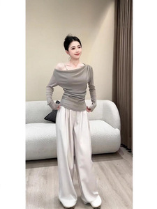 【欲感拿捏】褶皱一字肩纯欲修身长袖T袖女高腰阔腿裤早秋两件套