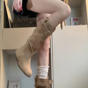 羊皮版~百搭褶皱堆堆靴小众设计显瘦圆头内增高小个子时装靴显瘦