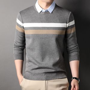 秋冬加绒假两件男士毛衣高级感翻领衬衫领休闲中年棉质针织打底衫