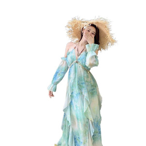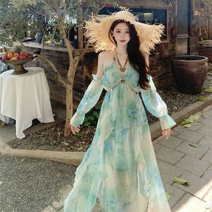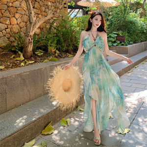 诗尚伊新款法式林间夏季浮夏度假吊带晕染连衣裙气质收腰印花长裙