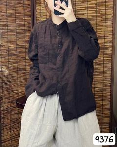 新品韩版宽松简约砂洗亚麻立领纯色衬衫百搭休闲衬衣女