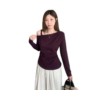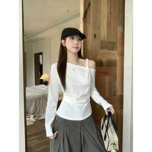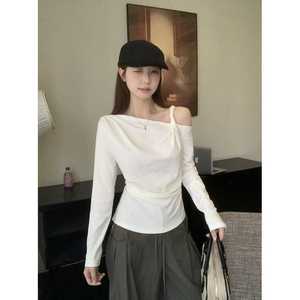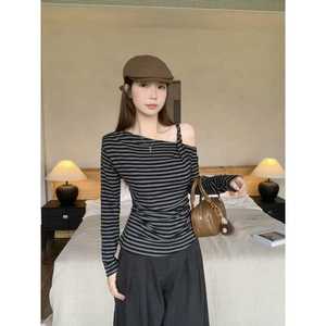 实拍2025秋新款胖mm大码女装时尚设计感露肩斜领显瘦条纹长袖T恤