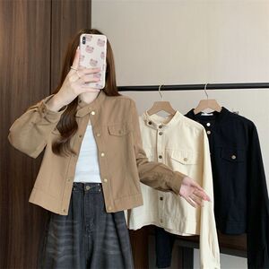 大码女装长袖立领咖色外套女秋季新款胖mm显瘦宽松短款复古夹克潮