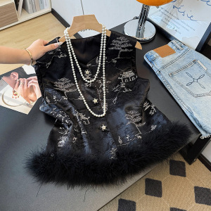 新款新中式国风鸵鸟毛刺绣马甲外套女秋季坎肩复古无袖外套上衣女
