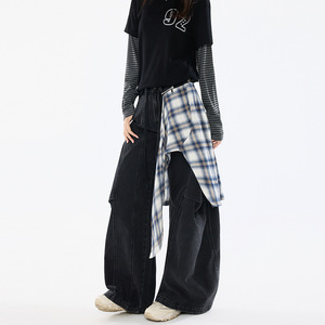 稚橘#格纹绑带潮流阔腿牛仔裤女宽松显瘦个性时尚百搭抽绳拖地裤
