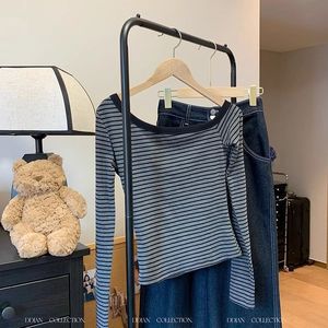 甜辣妹条纹斜肩长袖内搭T恤女春秋内搭2025新款修身短款露肩上衣