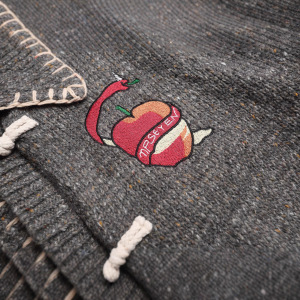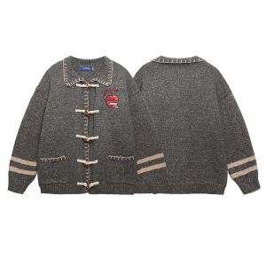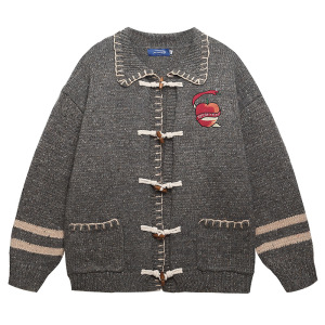 美式复古慵懒刺绣学院风牛角扣翻领苹果干刺绣开衫毛衣外套男女