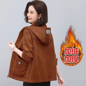 妈妈装灯芯绒外套女2025秋冬保暖新款加绒开衫连帽休闲上衣女加厚