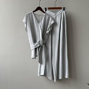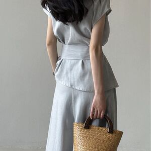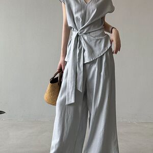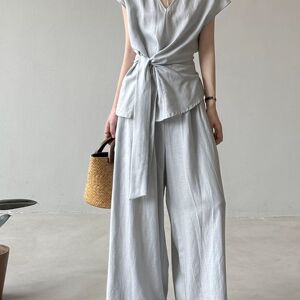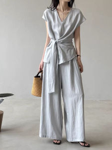 2025夏季新款棉麻V领绑带收腰衬衫+阔腿裤两件套女夏季时尚套装