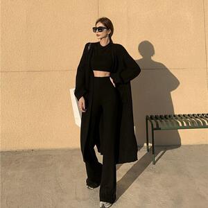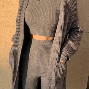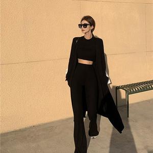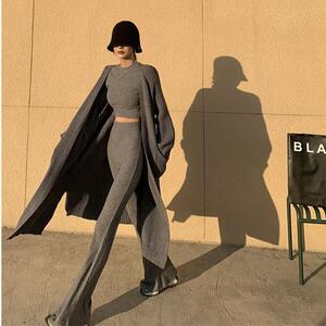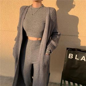韩国慵懒气质外套女短款套头毛衣喇叭裤子针织裤炸街秋冬三件套装
