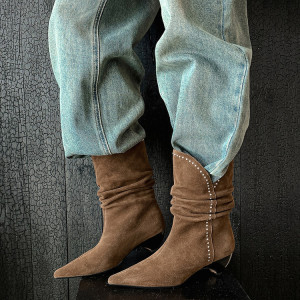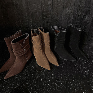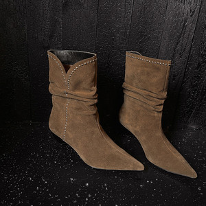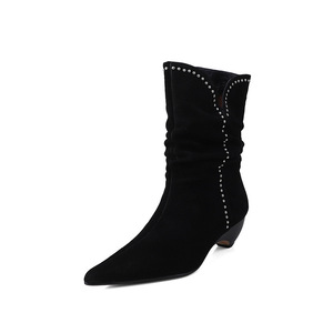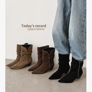 高丝光牛皮堆堆靴女中筒靴秋冬新款真皮粗中跟套筒尖头单靴女中靴