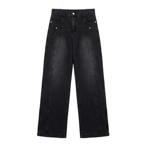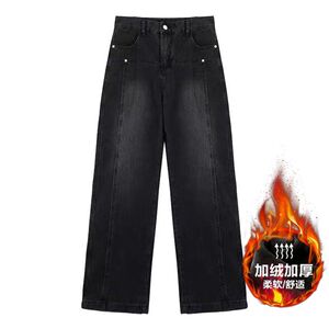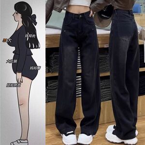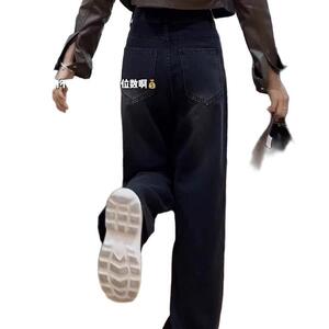 大码黑灰色阔腿牛仔裤女秋冬季新款加绒加厚高腰宽松显瘦直筒长裤