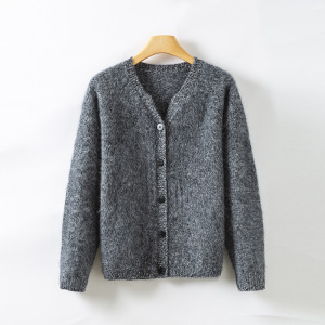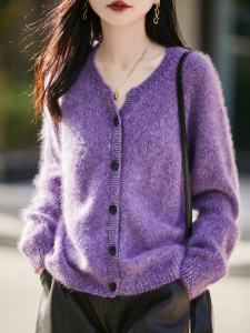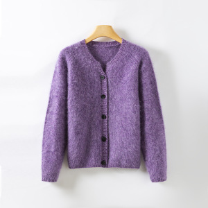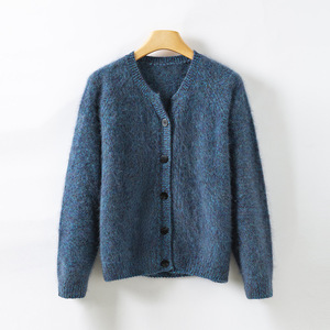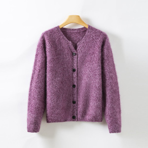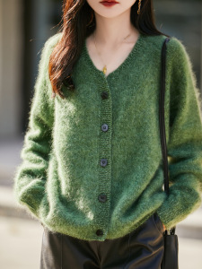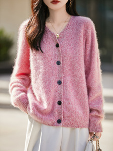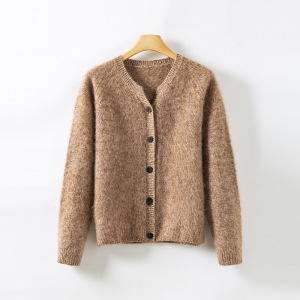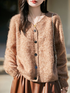 秋冬新款圆领厚款软糯羊毛羊绒拉毛针织开衫女宽松毛衣