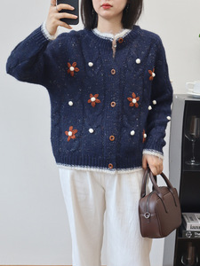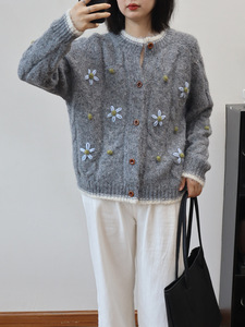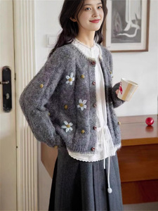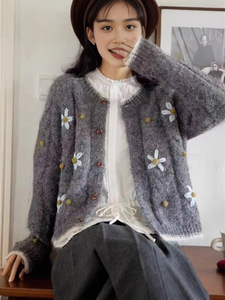 2025秋冬新款韩版宽松慵懒风针织开衫刺绣设计感温柔风毛衣外套女