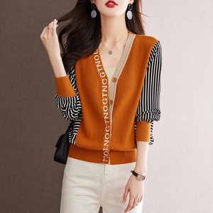 春秋装V领拼接棉线针织衫上衣女短款开衫外搭蝙蝠袖条纹毛衣外套