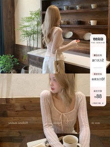 8uioio 云樱粉黛 粉色镂空针织衫女2025初秋新款长袖显瘦薄款上衣