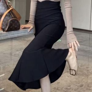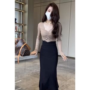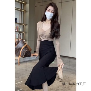 秋冬网红套装女2025新款褶皱长袖上衣+开叉鱼尾半身裙洋气两件套