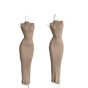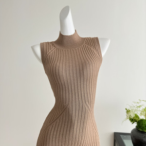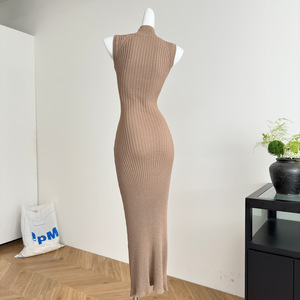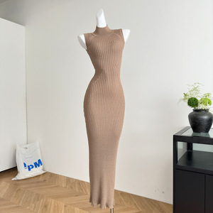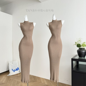 2025秋季新款 卡其色高领无袖紧身连衣裙长款正肩包臀针织裙