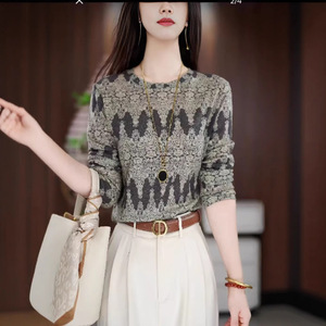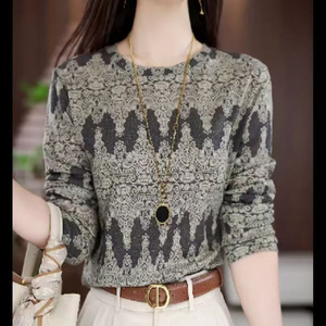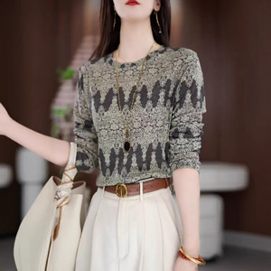 一件代发直播爆款2025春秋季新款印花圆领长袖T恤女士打底衫上衣