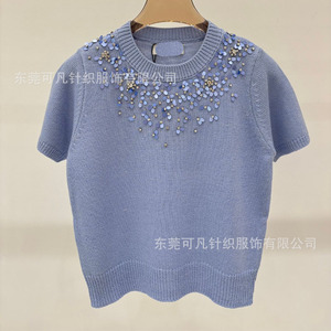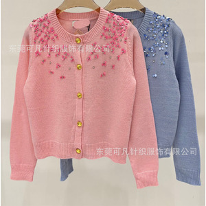MIU家小香风圆领针织长袖开衫女装订珠亮片外套女水钻针织衫毛衣